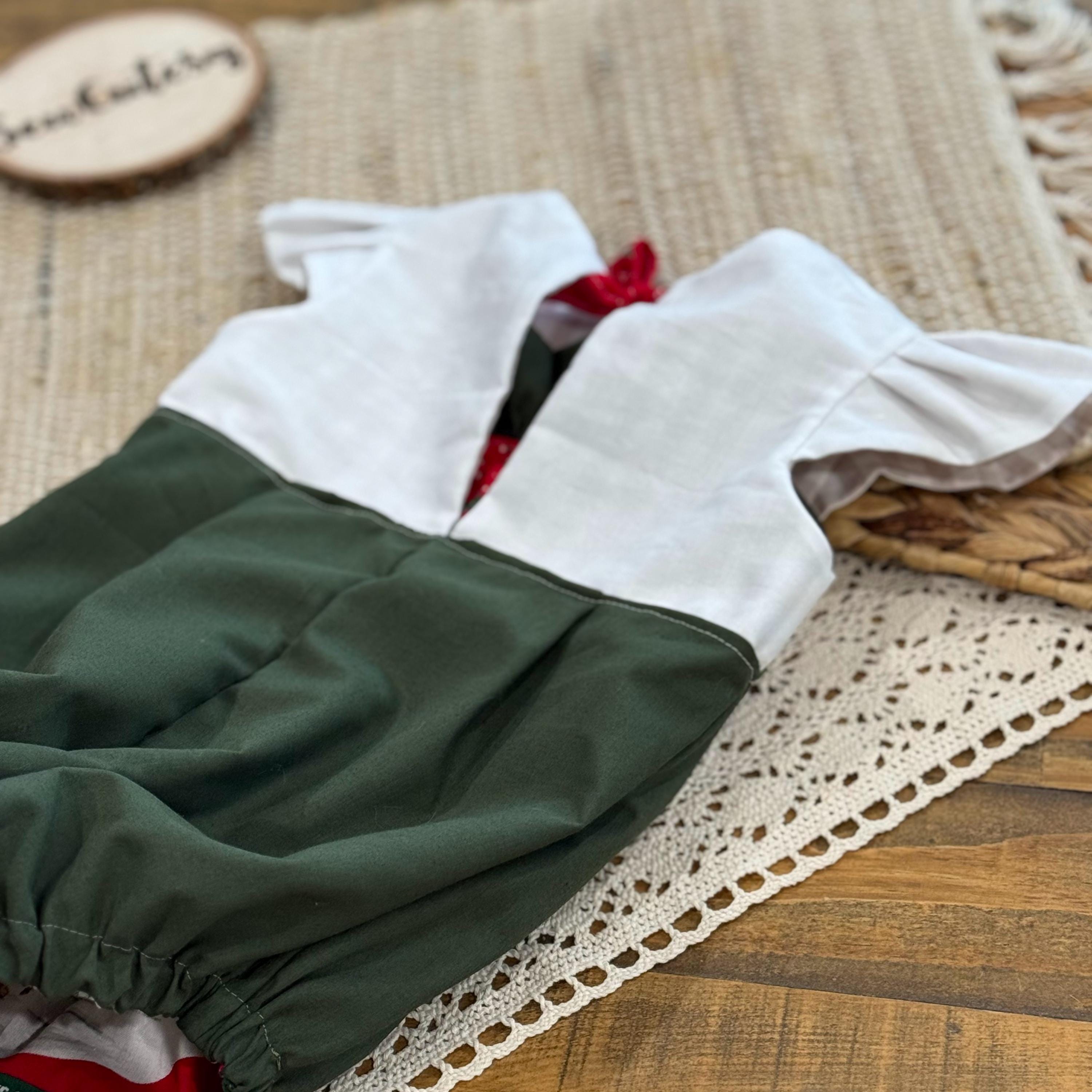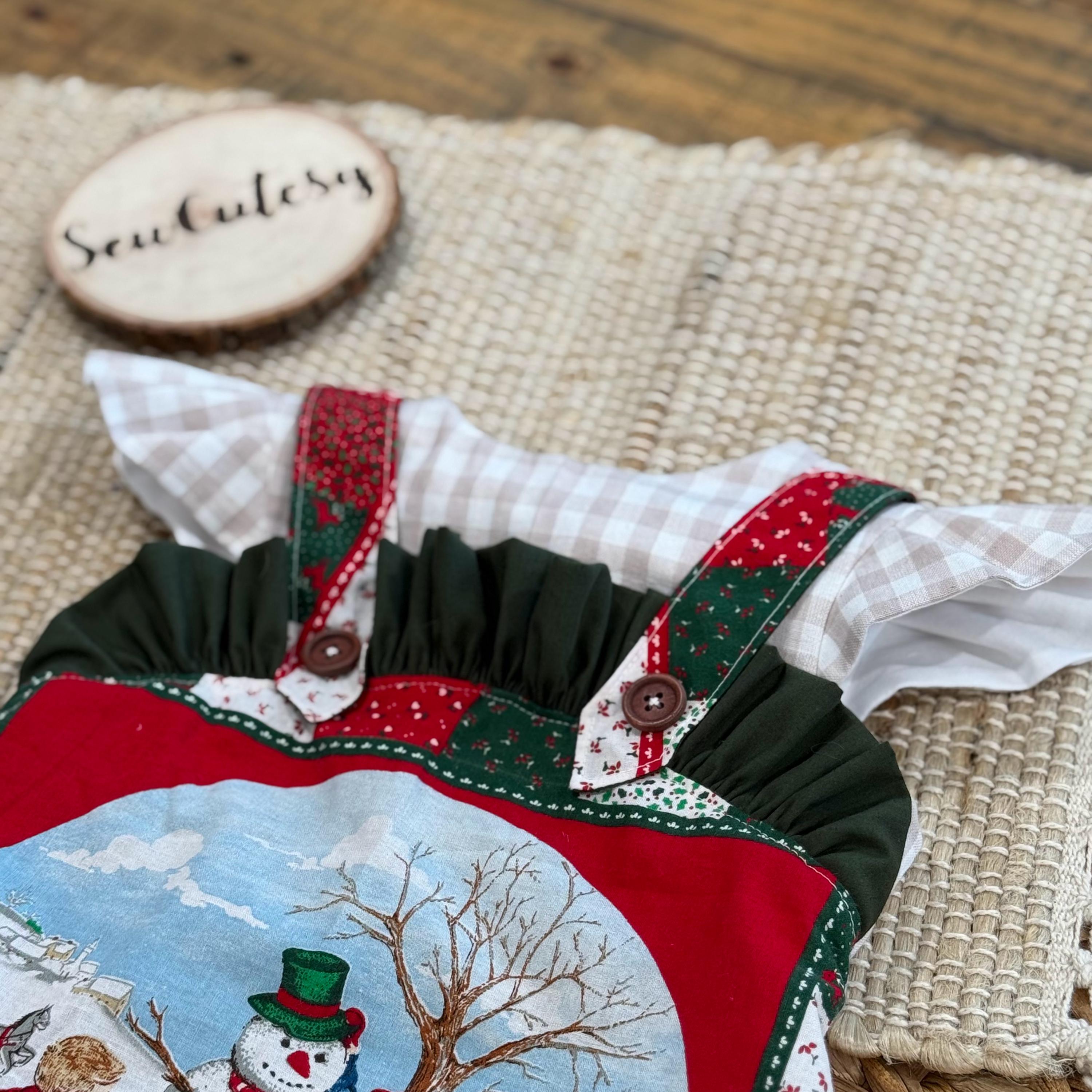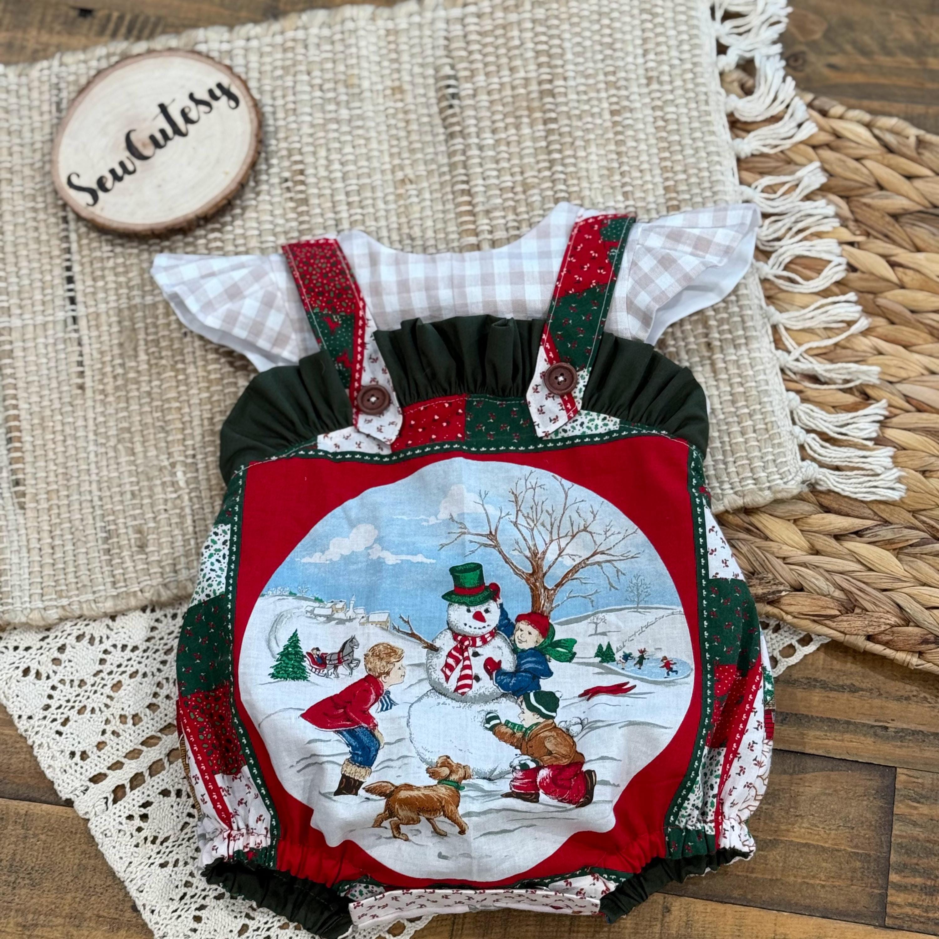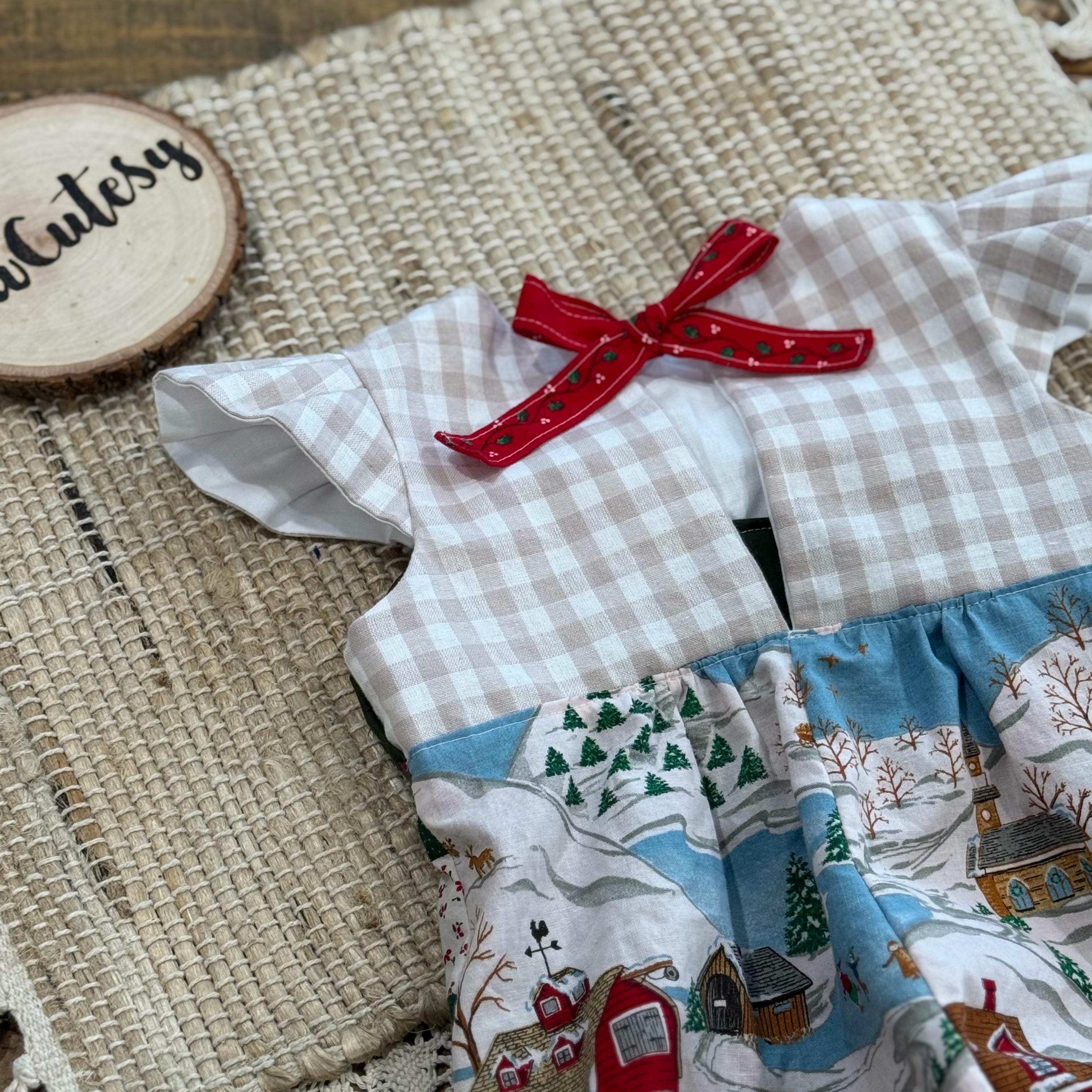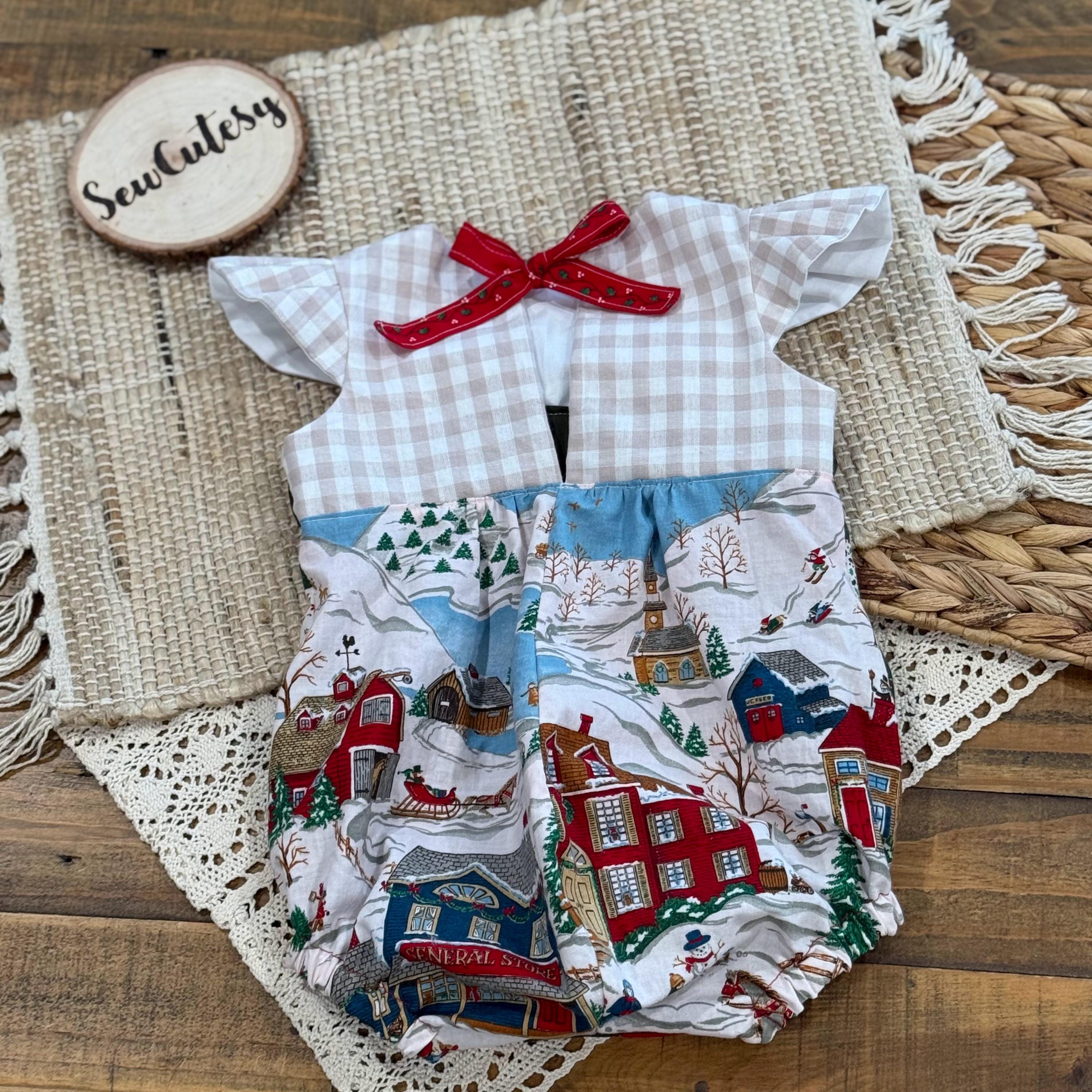 How adorable is this vintage style bubble romper made from old timey vintage christmas fabrics. This bubble was sewn together using heirloom sewing techniques, which mean all seams are totally enclosed. Even the snap backs and elastics are hidden. This romper is a slide on romper with ties that close the back with a tiny bow and snaps at the bottom for easy changes. This romper would be so adorable paired with leggings or high socks!