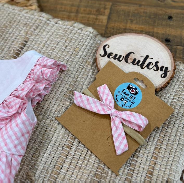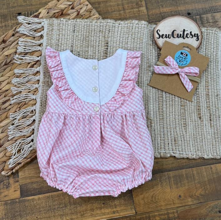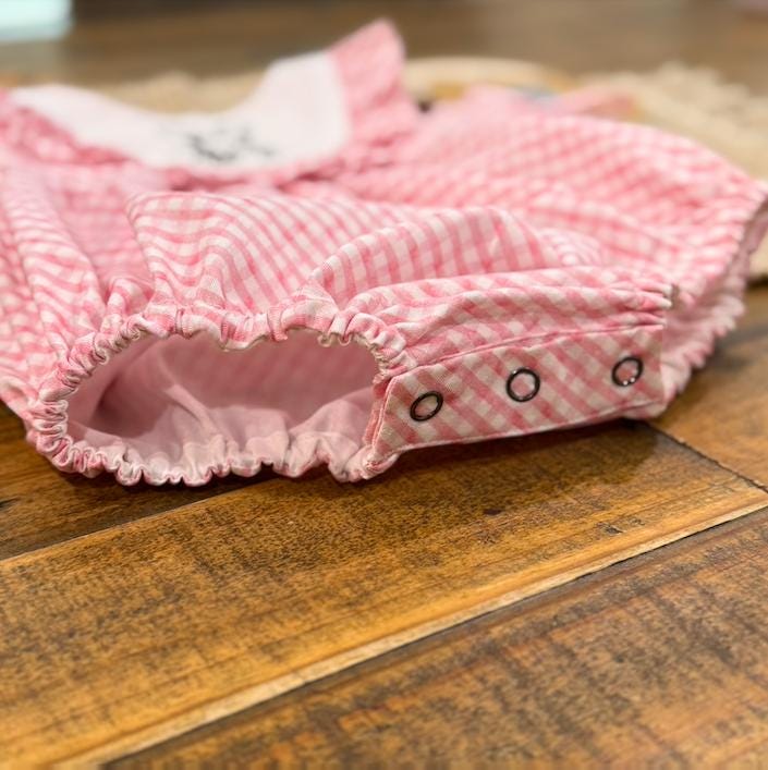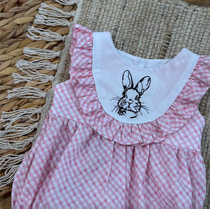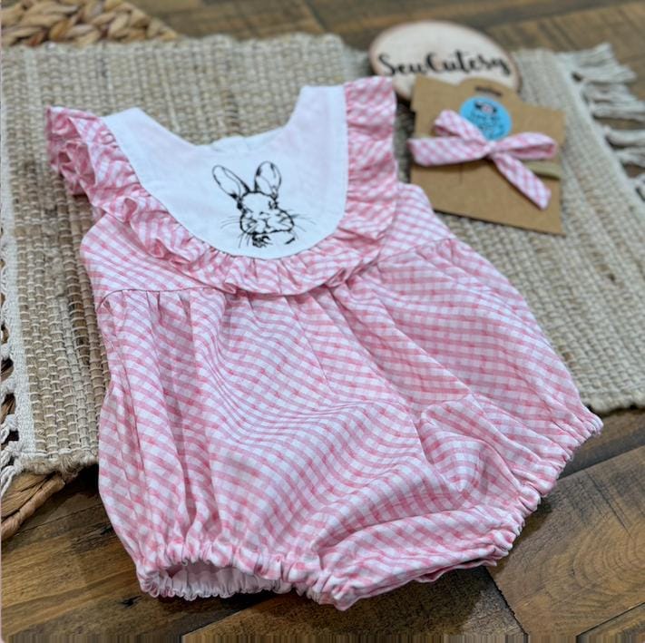 Is this not the sweetest bunny easter romper out there?! Featuring ruffles and a embroidered bunny on the bodice that is lined, so no need to worry about itchy embroider touching baby girls skin. This vintage style bubble has a button back closure and snaps at the crotch for easy changes! Handmade with love by me with this beautiful pink bias gingham cotton fabric. This would be the perfect spring outfit for this Easter. I added in a matching bow because what little one doesn't look extra precious when wearing a bow!