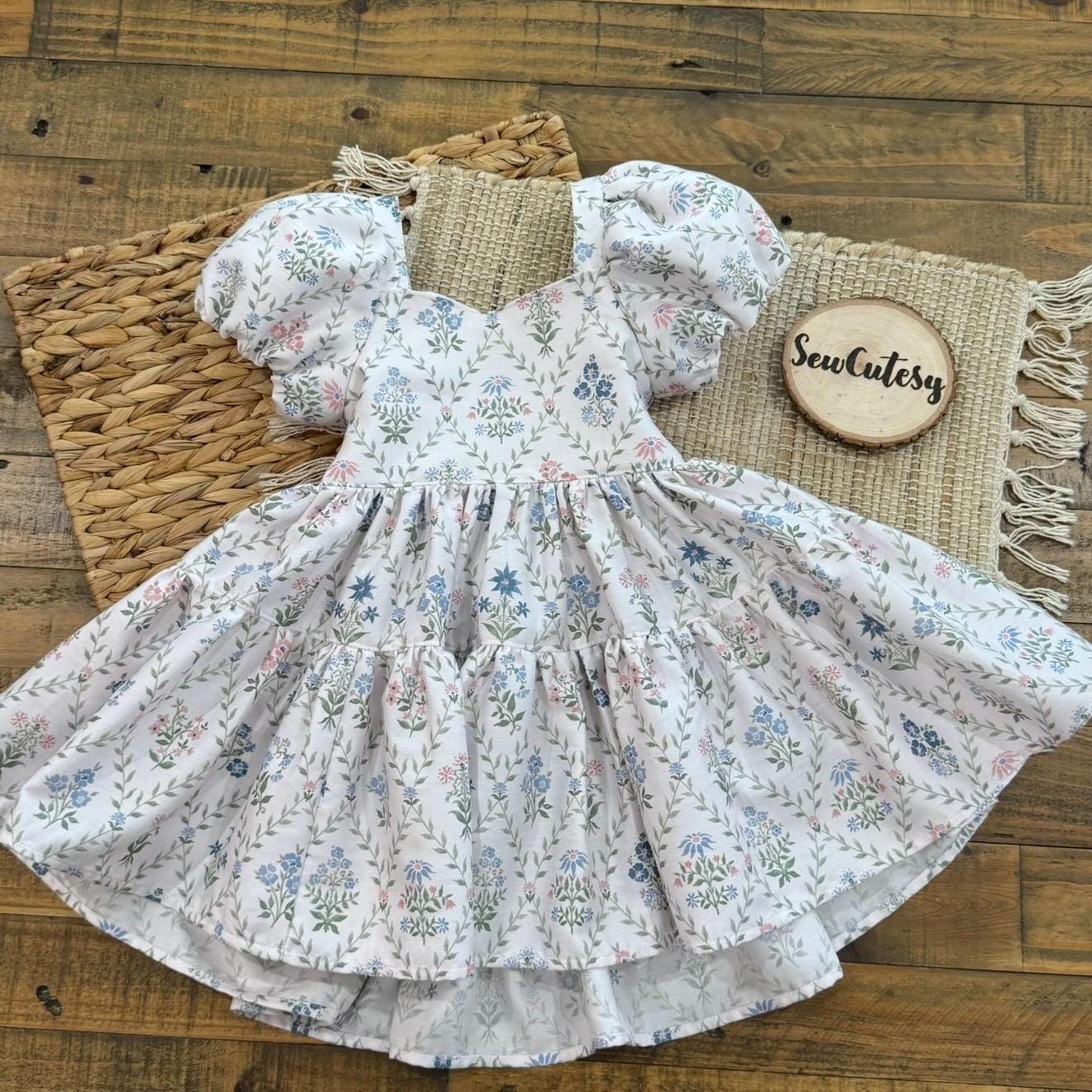 Imagine your sweet little one twirling into spring in this beautiful floral dress. This style dress is one of my favorites - featuring a bow tie back, elastic on the back for a good fit and puff sleeves that are lined. The skirt has the most perfect amount of fullness to it for the most perfect twirl. These will be made to order in size 1 year up to 6 years. Size chart will be in the photos :) Seriously the sweetest cotton spring dress!